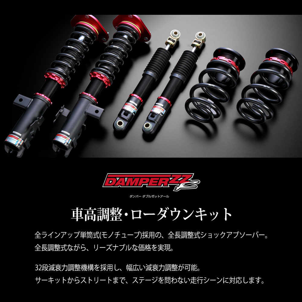 【適合車両】●車名:TOYOTA ヴィッツ●型式:KSP130/NSP130/NCP131●年式:2010/12〜●エンジン:1KR-FE/1NR-FE/1NR-FKE/1NZ-FE●備考:リアショック上部要内装加工───────────────────【商品情報】●分類:車高調整・ローダウンキット●メーカー:ブリッツ●品名:ダンパーダブルゼットアール●品番:92798※リア減衰ダイヤル位置はアッパーマウント上側◆フロント詳細 車高調整範囲:-60mm〜-10mm レート:5.0kgf/mm 自由長:200mm マウント:純正 スプリング:ID62ストレートスプリング 付属スタビリンク:非調整式◆リア詳細 車高調整範囲:-45mm〜-5mm レート:3.0kgf/mm 自由長:190mm マウント:純正 スプリング:樽型orテーパー型専用形状スプリング───────────────────・単筒式構造採用の全長調整式車高調キット・32段減衰力調整機構を採用し幅広い減衰力調整が可能・ストリートからサーキットまであらゆる走行シーンに対応全ラインアップ単筒式(モノチューブ)採用の、全長調整式ショックアブソーバー。