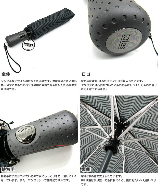 ブランド名 TOTES / トーツ 商品名 ワンタッチ開閉式 折りたたみ傘 商品番号 7550 素材 【生地】ポリエステル100% 生産国 MADE IN CHINA カラー B86 / BLK / NAV / CHA 重量 約490g サイズ展開 ワンサイズ BLKの仕様について 製造時期・入荷時期の違いにより、収納袋、取手、縁部分のデザインが異なる場合がございます。
