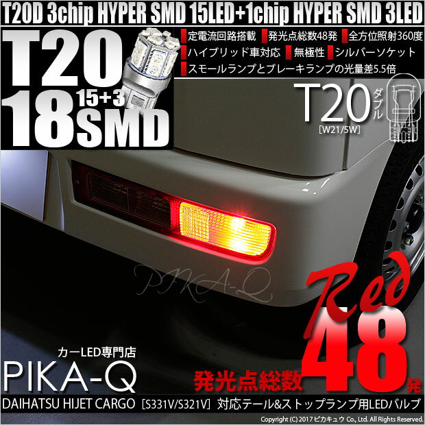 ダイハツ ハイゼットカーゴ[S331V/S321V]対応テール&ストップランプ用LEDバルブ T20ダブル HYPER SMD18連ウェッジダブル LEDカラー:レッド 1セット2個入り テール&ストップランプ用T20ダブルウェッジLEDバルブ。